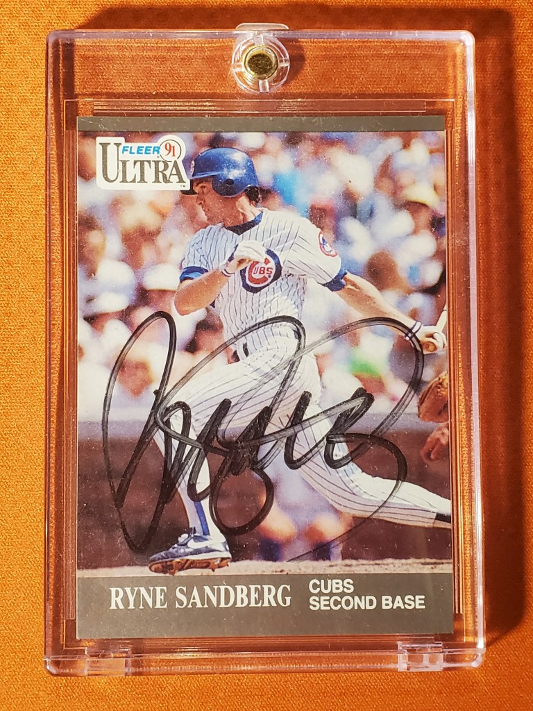 Summer of 1991, my father (Al) took my brother (Ben) and I to a Cubs game at Wrigley Field. This game was rained out and I was devistated. As we waited for our bus, I went to a chain link fence to see what was going on. To my surprise, my favorite Player was walking out, RYNE SANDBERG!! I was shocked and nervous. I pulled out this new Fleer Ultra Card I had in my holder and he signed it for me.