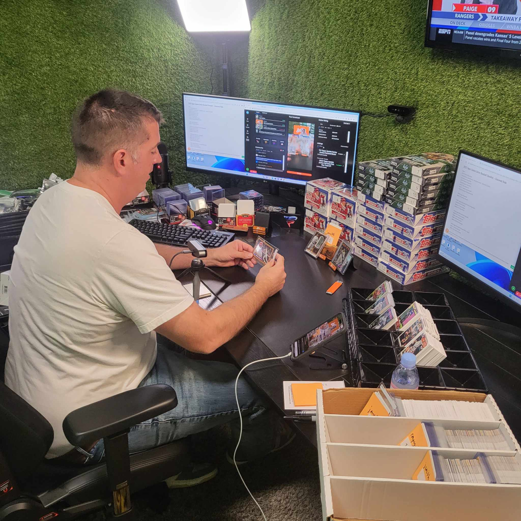 Back into work. Double check pricing, get ready for a busy day, make sure we have all the products! We started going live at 9 am selling boxes of new release, Bowman Chrome Universtiy Football. We anticipated being live from 9 to noonish selling boxes, then again live at 5 pm. We went live at 9 and ended at 10:30 pm! 13 1/2 hours live streaming. Wild!